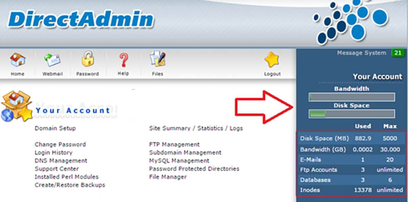 Khi sử dụng DirectAdmin, mọi nhiệm vụ sẽ được tự động hoá. Ưu điểm nổi trội nhất của phần mềm này là bạn có thể thay đổi được các file. Cũng như đề cao tính an toàn, bảo mật cho người sử dụng. Hãy tìm hiểu cách kiểm tra dung lượng hosting bằng DirectAdmin dưới đây nhé
