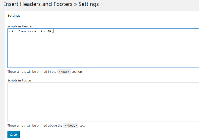 Chọn Settings (Cài đặt), click mục Insert Headers and Footers. Tại Scripts in Header, dán đoạn code vào sau đó chọn Save