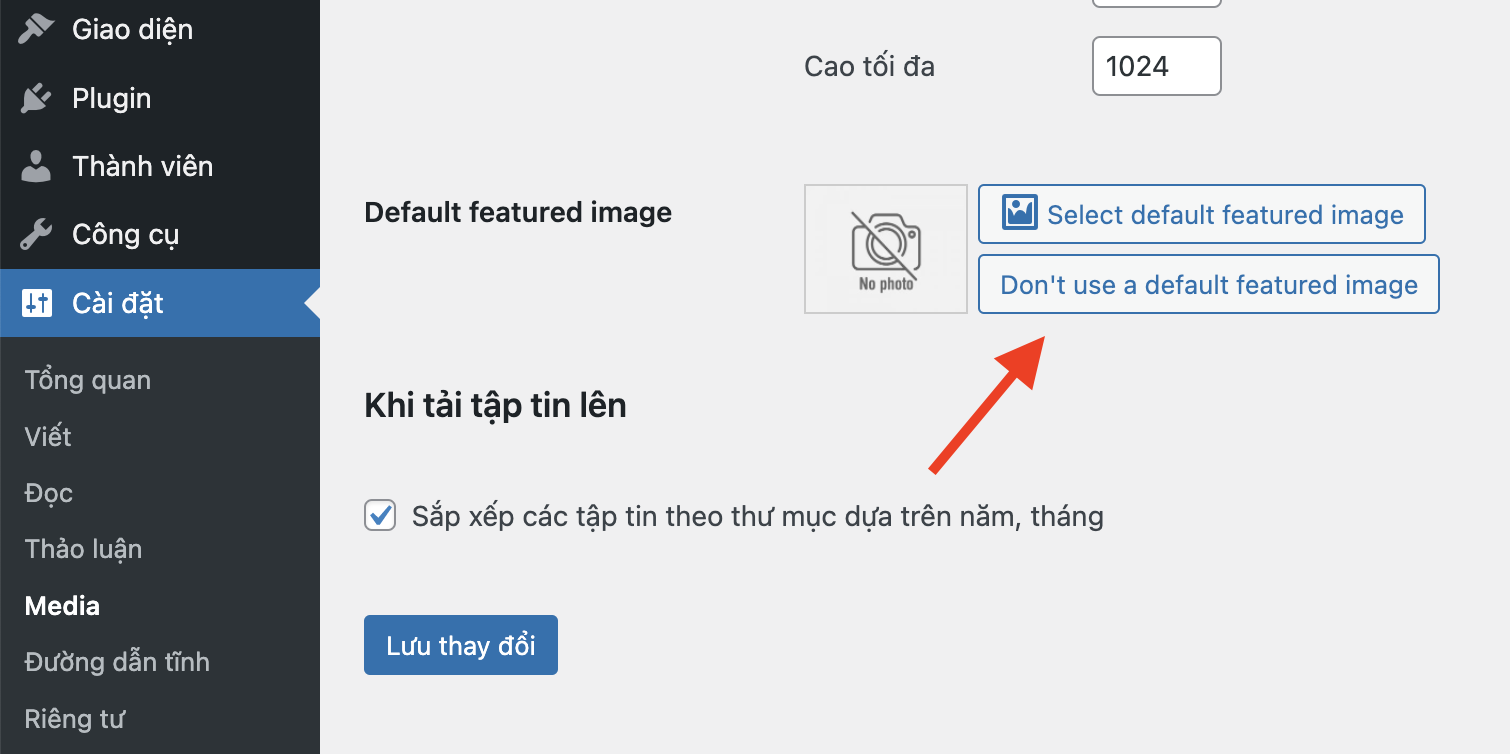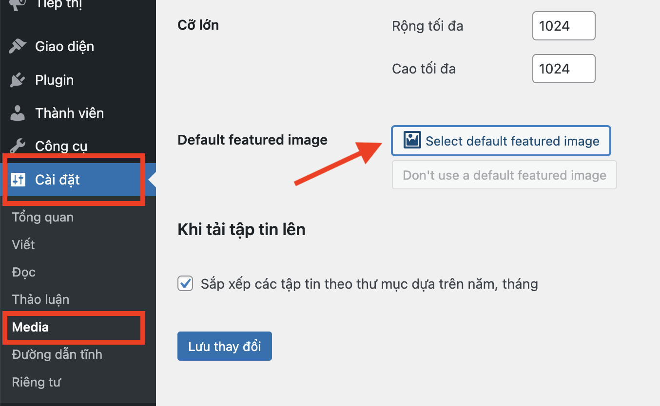 Sau khi kích hoạt, bạn hãy vào Cài đặt > Media. Sau đó click vào nút Select default featured image để chọn hình ảnh.