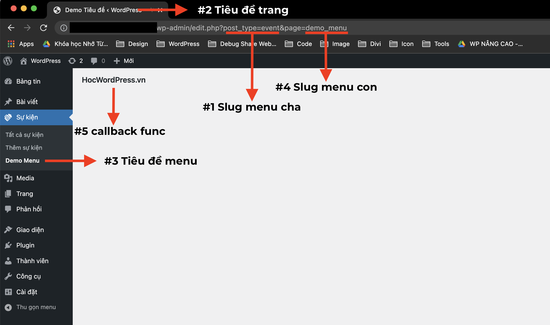 Sau khi thêm đoạn code trên vào file function, kết quả bạn sẽ được như hình bên dưới. Hình bên dưới cũng bao gồm chú thích các phần tử ở trong hàm add_submenu_page().